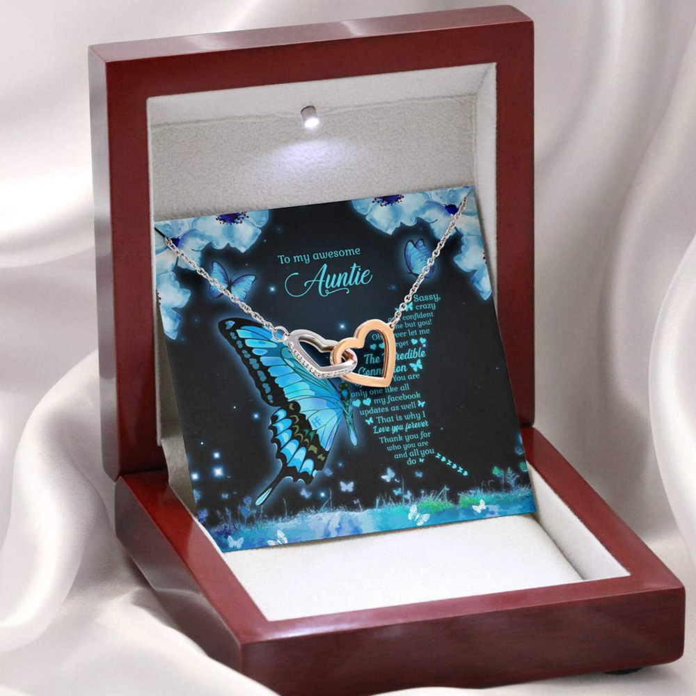 Aunt Necklace, Butterfly Gift For Your Awesome Auntie On Mother, Interlocking Hearts Necklaces a captivating symbol of enduring love, gracefully combines two hearts embellished with cubic zirconia crystals, making it a timeless and meaningful accessory for any occasion. The message card can be personalized with photos, names, nicknames, dates, or text.
