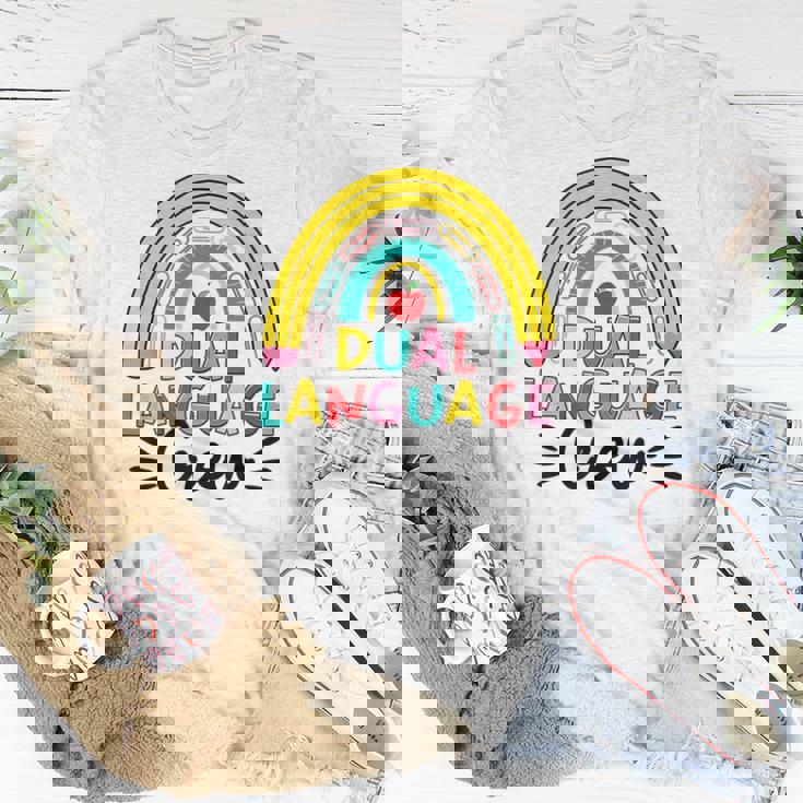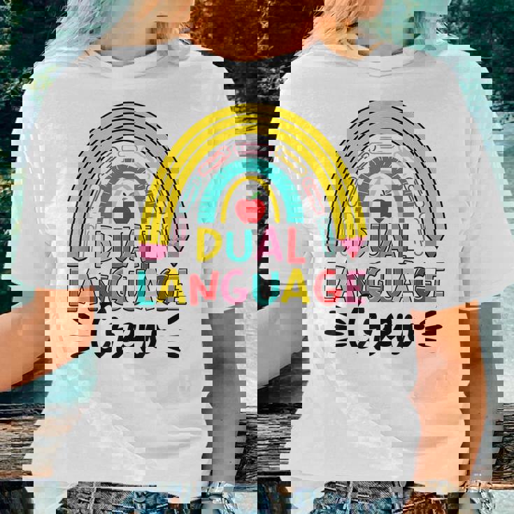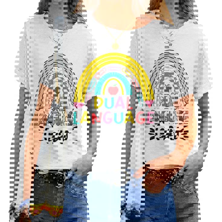 Bilingual Teacher Rainbow Dual Language Crew Maestra Spanish Women T-shirt