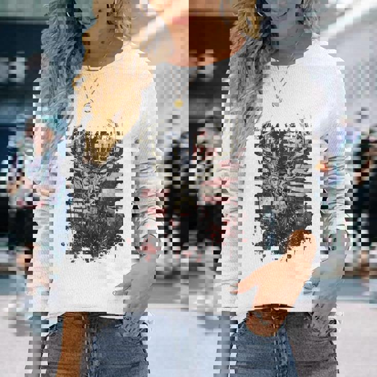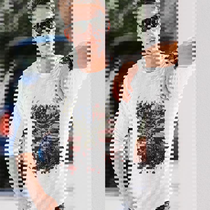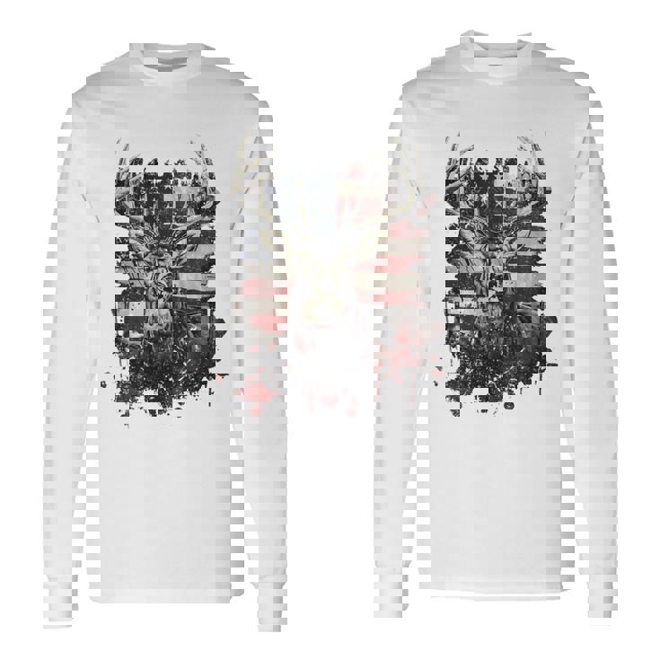 Buck White Tail Deer Hunting Hunter Distressed American Flag Long Sleeve T-Shirt