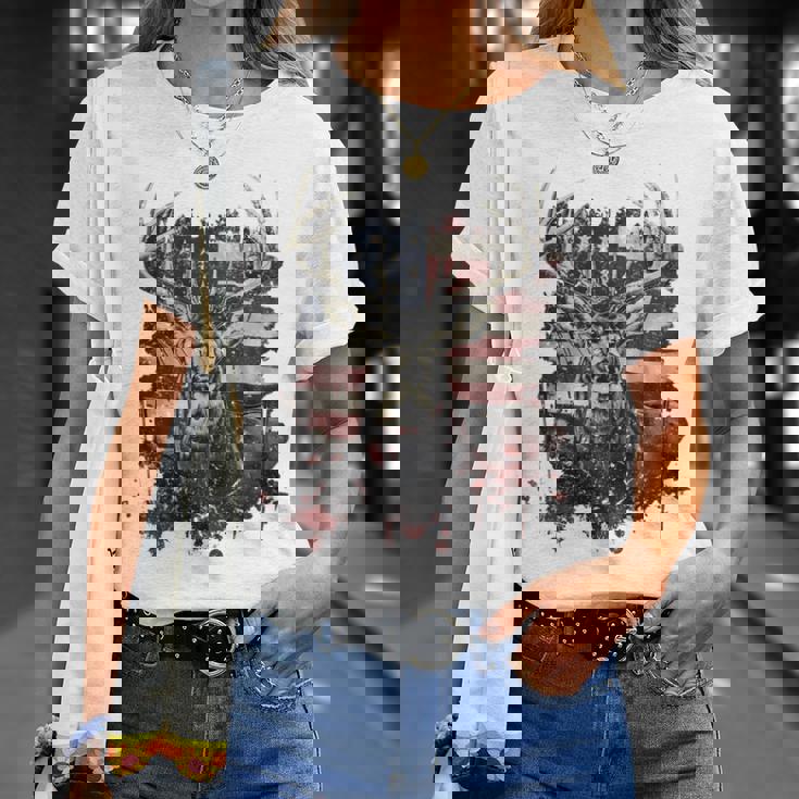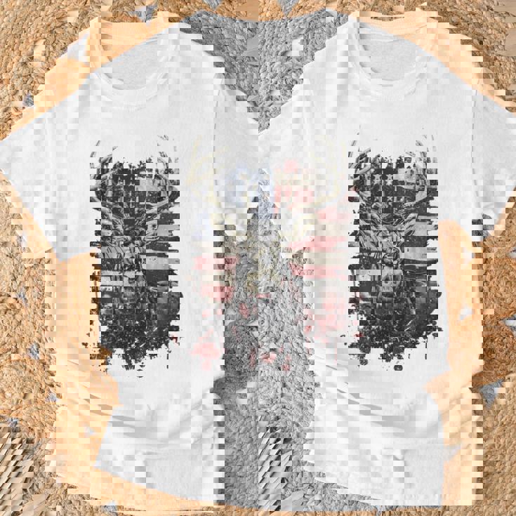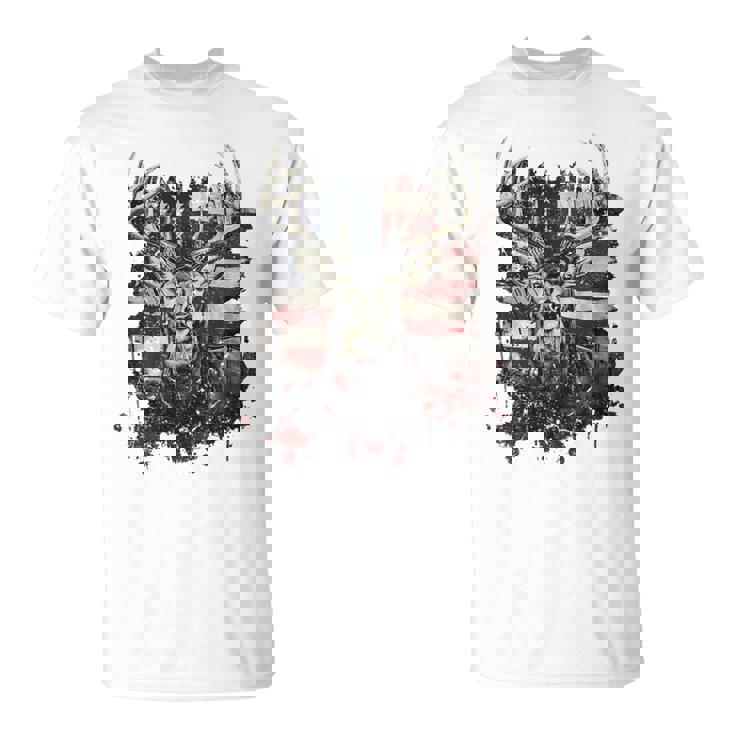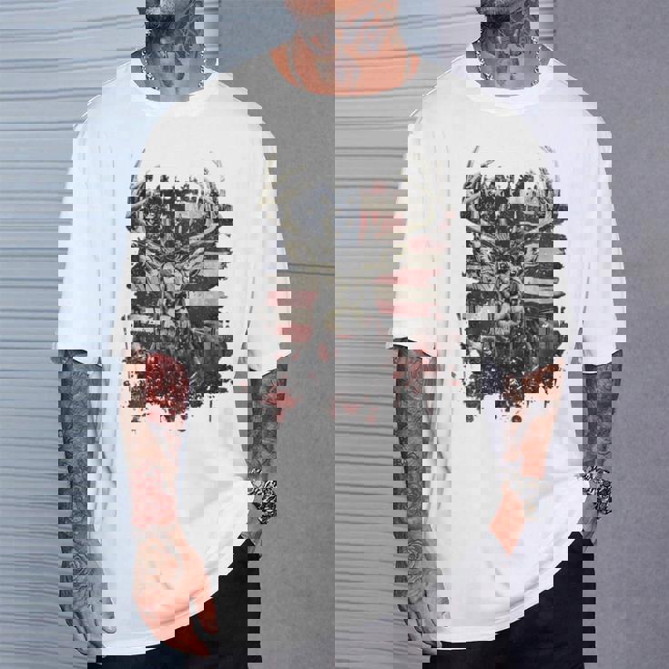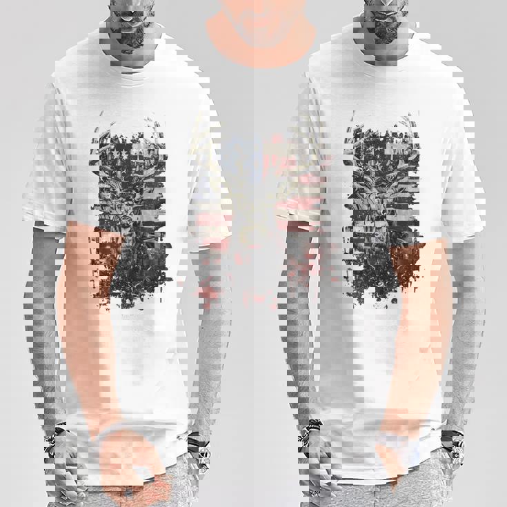 Buck White Tail Deer Hunting Hunter Distressed American Flag T-Shirt