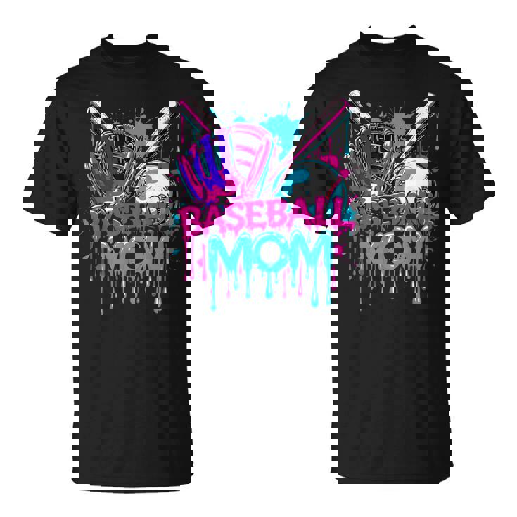 Baseball Mom design. Celebrate your MVP with this bold Baseball Mom tee! Features a neon pink and blue splatter design with gloves, bats, and baseball. Perfect for game days, tournaments, or cheering from the stands in style.