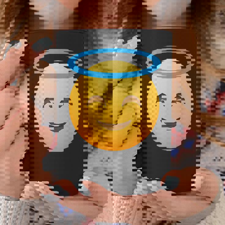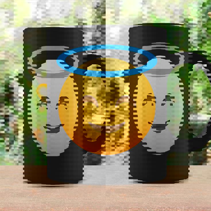 Emoticon Smiling Face With Halo Angel Coffee Mug is a conversation starter, a gift of appreciation, and a durable companion for your favorite beverages.