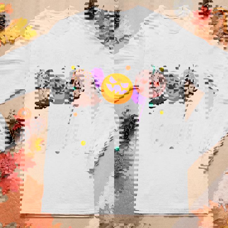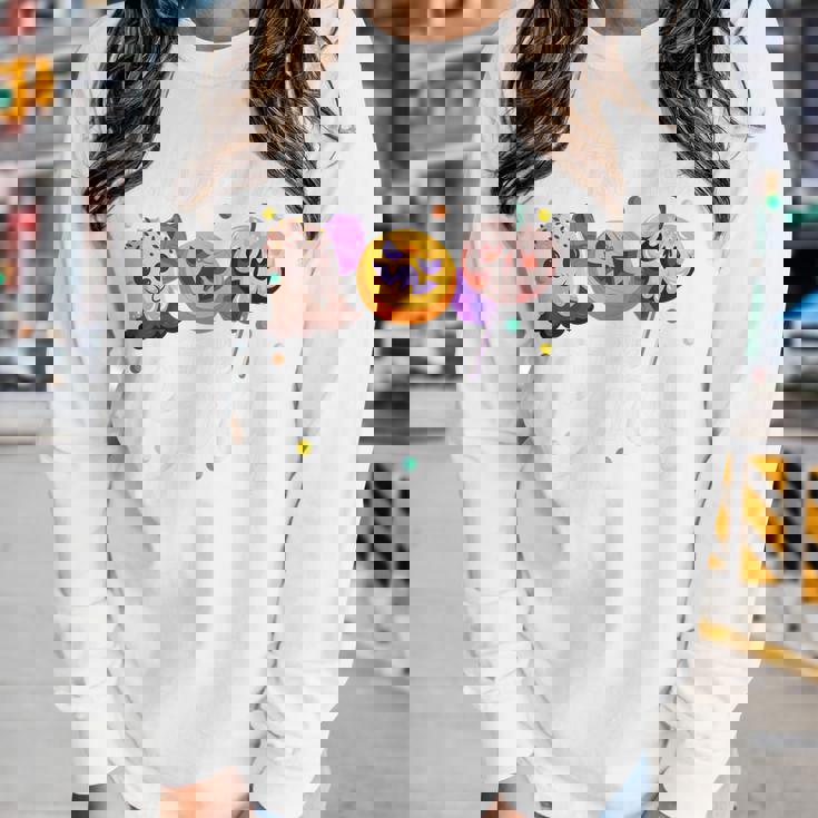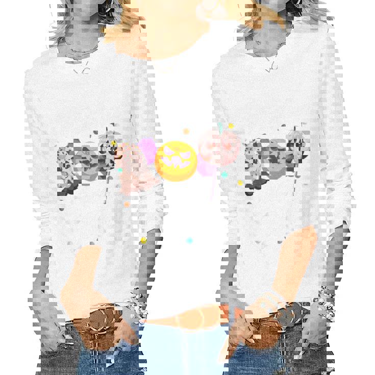 Kids Im Just Here For The Candy Halloween Cute Lollipop Sweets Women Graphic Long Sleeve T-shirt showcases creative designs for a stylish and cozy wardrobe addition.