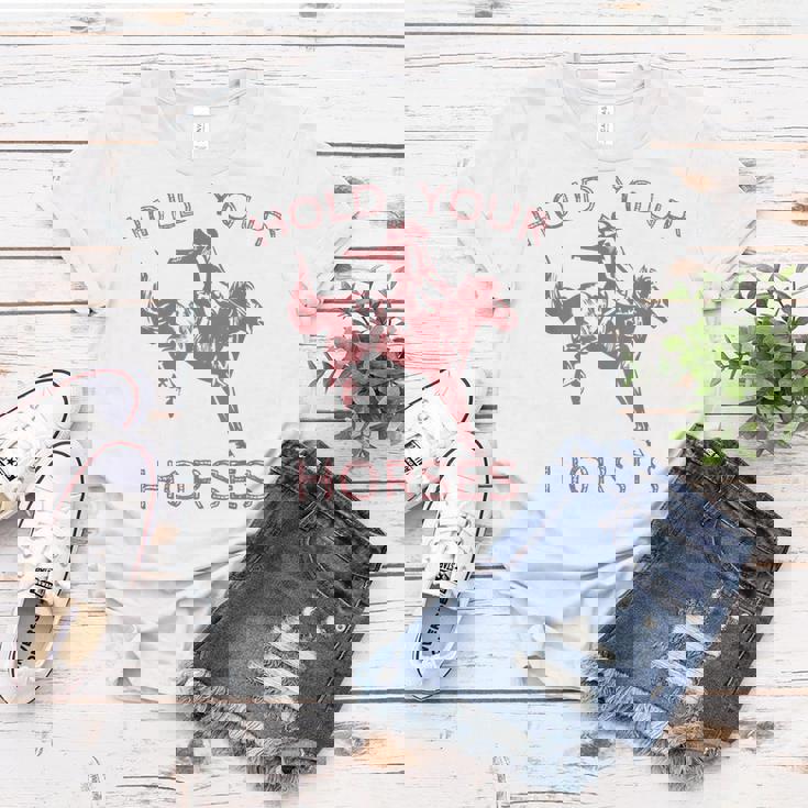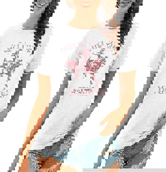 Retro Cowboy Hold Your Horse Rodeo Wild West Country Cowgirl Women T-shirt is a fashionable and flattering way to add some personality to your wardrobe.